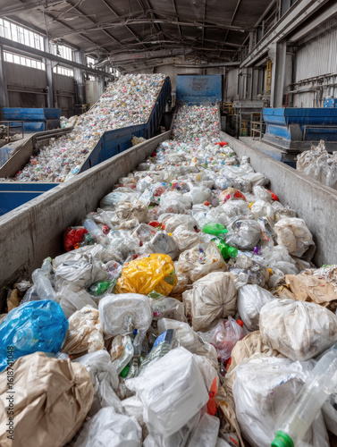 A busy waste facility with sorted plastics and bottles, showcasing the recycling process in action