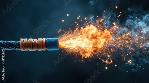 A cable ejecting fiery orange sparks and smoke in a dimly lit setting, symbolizing explosive energy and the volatile nature of electrical failures.