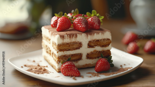 A cake with strawberries on top and a chocolate drizzle. The cake is placed on a white plate