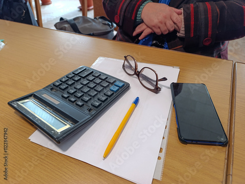 A calculator pen glasses and a cell phone sitting on a table