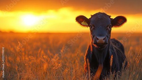 A calf stands in a golden field during sunset, capturing a serene rural moment.