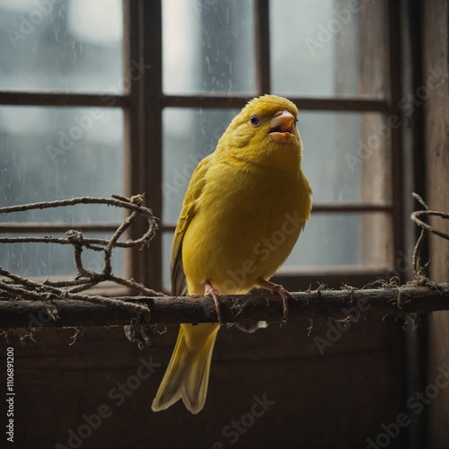 A canary singing in a cage near an open window.