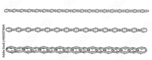A captivating 3D render showcasing multiple strands of intricately designed metal chains, each link featuring ornate, gothic-inspired detailing with a gleaming metallic finish. Ideal for themes of fan