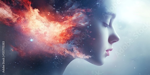 a captivating artistic portrait of a woman's profile, with celestial elements merging with her form