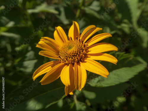 A captivating medium shot of a bright yellow Heliopsis flower with green leaves in the background