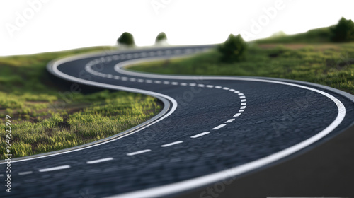 A car driving on an empty asphalt road surrounded by trees and grass under a clear sky