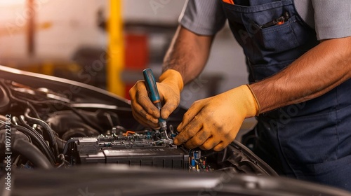 A car mechanic skillfully repairs an engine in a workshop, showcasing precision and attention to detail while using tools for automotive maintenance.