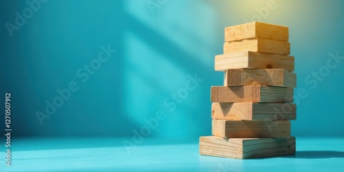 A Carefully Balanced Stack of Wooden Blocks on a Teal Surface, Representing Strategy, Risk, and Careful Planning in a Business or Life Context