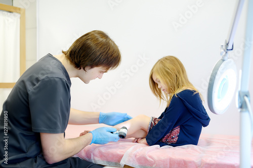 A caring doctor checks moles on the skin of a small child using lamp with magnifying glass. A dermatologist looks at a rash on the leg of a girl