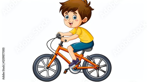 A cartoon boy is riding a bike and smiling.