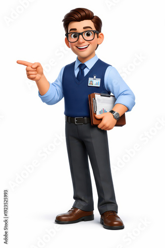 A cartoon character in business attire smiling and pointing.
