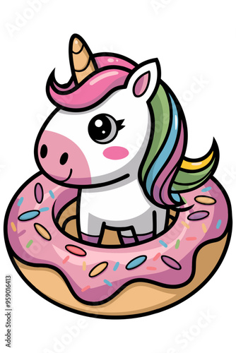 A cartoon illustration of a pink unicorn is holding a doughnut in its hooves.