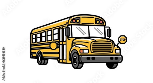 A cartoon illustration of a yellow school bus with a stop sign on the side isolated on white