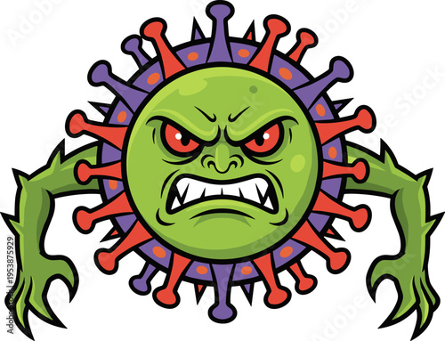A cartoon illustration of an angry green virus character with a menacing face, spiky protrusions in purple and red, and clawed green arms. The image is isolated on a white background.