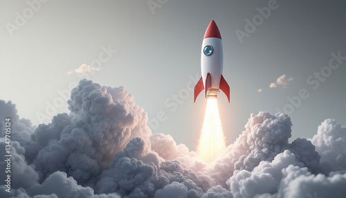 A Cartoon Rocket Ship Blasts Off Amidst Fluffy White Clouds