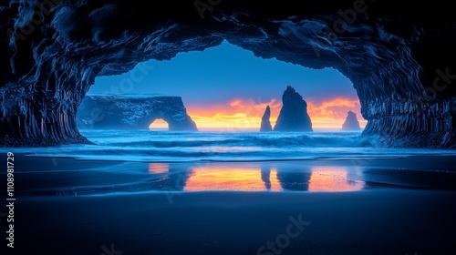A cave on the beach with a sunset in the background