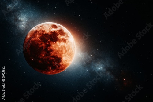 A celestial view of the lunar eclipse, with stars and galaxies faintly visible around the moon reddish glow