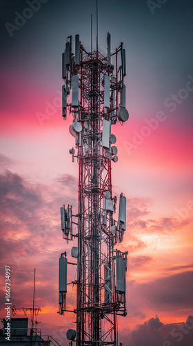 A cellular communication tower loaded with antennas above the city, representing wireless network coverage reliability and high speed digital connectivity for modern services