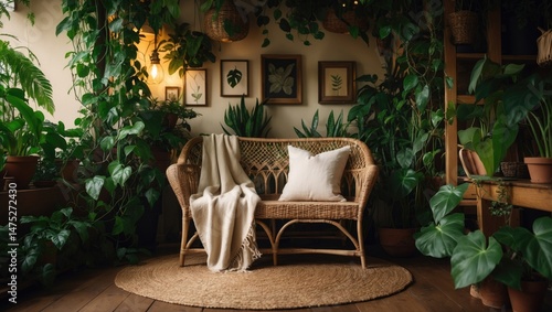 A charming and inviting sitting area brimming with plants and antique pieces.