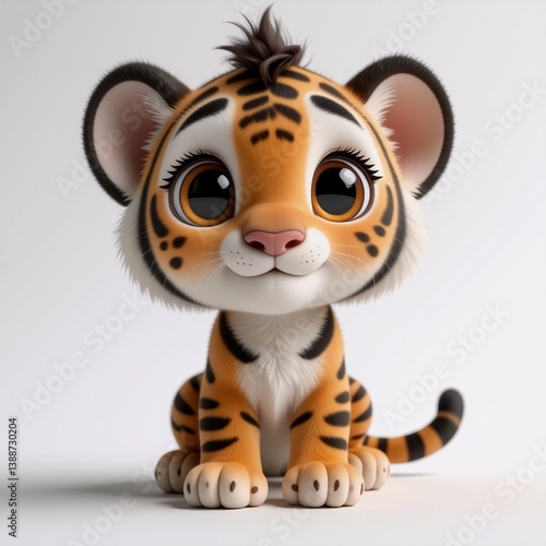 A charming baby tiger with large, expressive eyes and soft fur sits against a plain backdrop, showcasing its playful and adorable nature.