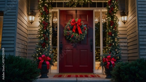 A charming front door decorated with a large wreath, frosted pinecones, and garlands of greenery, illuminated by lanterns.