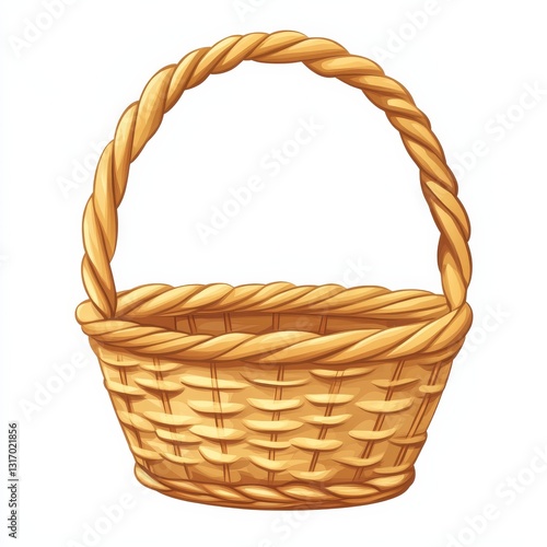 A charming hand-woven wicker basket with a graceful handle, isolated on a clean white background, perfect for springtime picnics