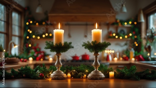 A charming kitchen setting featuring two candles surrounded by vibrant greenery, setting a festive mood for joyful family and friends moments during the holiday season.