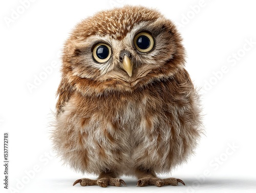 A charming little owl stands on a white surface displaying its round eyes and fluffy brown feathers closely.