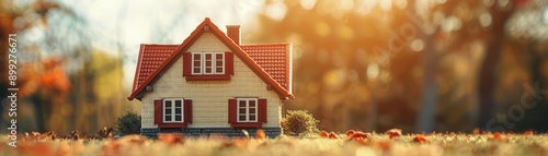 A charming miniature house set in a warm, autumn landscape, evoking feelings of coziness and tranquility.