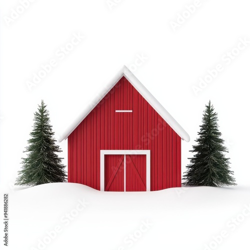 A charming red barn surrounded by snow-covered trees, creating a picturesque winter landscape.