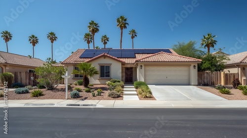 A charming single family home with solar panels on the roof surrounded by lush landscaping and tall palm trees under a clear blue sky