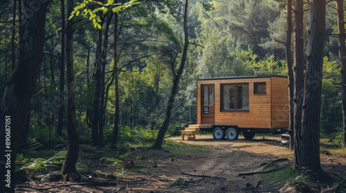 A charming tiny house sits in a peaceful forest clearing, surrounded by tall trees and bathed in warm, dappled sunlight.