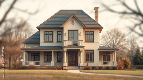 A charming two-story house with a beige exterior, blue roof, and inviting porch surrounded by trees.