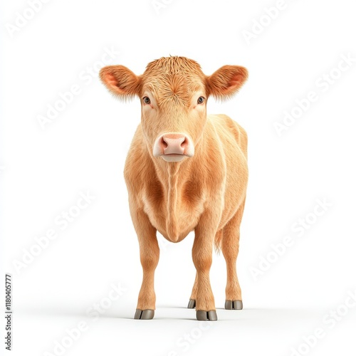A charming young Charolais cow standing posed against a white background, showcasing its gentle demeanor and soft features.