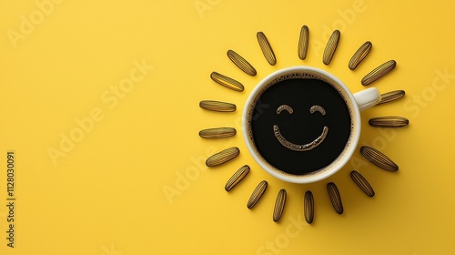 A cheerful coffee cup surrounded by biscuit rays on a vibrant yellow background, evoking a sunny, joyful mood.
