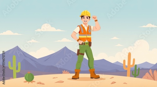 A cheerful construction worker stands confidently in a desert landscape, symbolizing hard work.