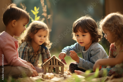 A cheerful group of charming children in a playful setting of a kindergarten is engaged in educational activities.