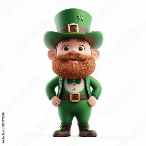 A cheerful leprechaun character wearing a green outfit and hat, complete with a shamrock, symbolizing Irish culture and St. Patrick"s Day festivities.isolate on white background