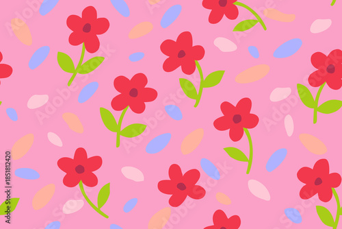 A cheerful seamless floral pattern with bright red flowers and green leaves on a soft pink background, accented by colorful abstract dots for a playful feel.