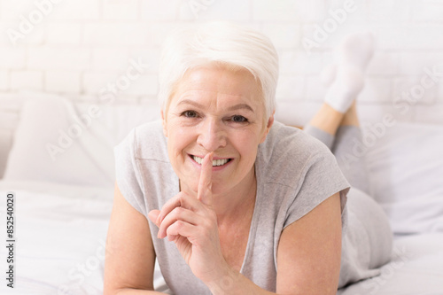 A cheerful senior woman with short white hair lies on her stomach on a bed, her eyes beaming with joy. She places her finger on her lips, suggesting a playful secret or a quiet moment