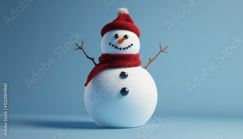 A cheerful snowman wearing a red scarf and hat stands against a bright blue backdrop