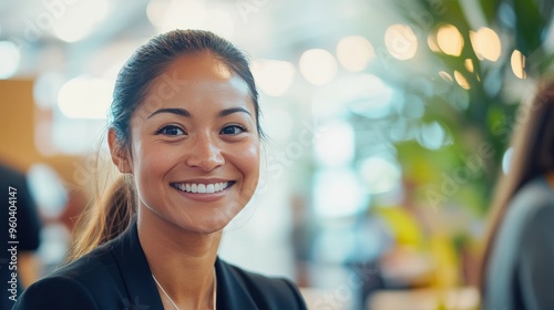 A cheerful woman with curly hair smiles warmly during a friendly conversation in a casual setting, creating a relaxed atmosphere.