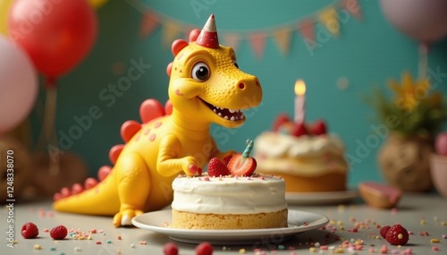 A cheerful yellow dinosaur enjoys a birthday cake slice , blue background, cake slice