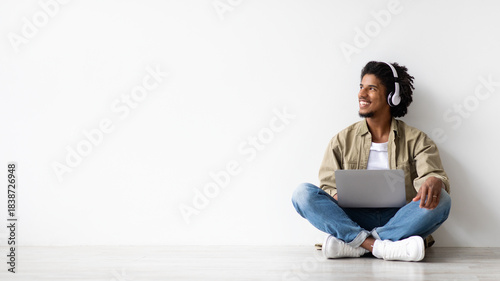 A cheerful young Black man relaxes on the floor, wearing wireless headphones and smiling while using his laptop.