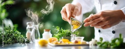 A chef preparing fresh ingredients with herbs and citrus in a vibrant kitchen setting.