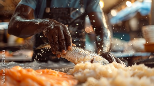 A chef skillfully filleting fresh fish in a bustling market, caught in motion.