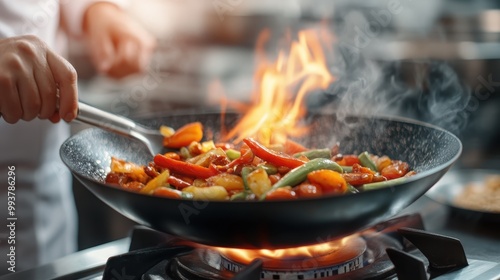 A chef stirs an array of colorful vegetables in a hot pan with intense focus, while vibrant flames flare up, epitomizing the dynamic and skillful nature of culinary arts in a modern kitchen.