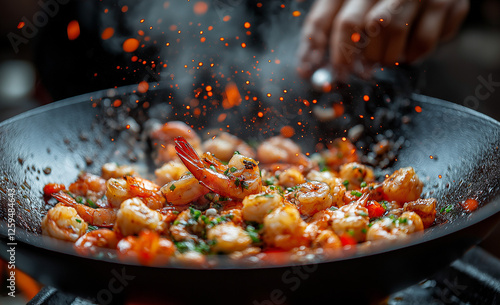 A chef’s hand, wearing a black apron, skillfully tossing shrimp and colorful vegetables in mid-air from a sizzling pan. Captured against a dark black background with professional studio lighting