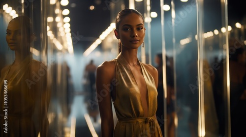 A chic fashion model in luxurious attire, confidently walking the catwalk with a radiant smile.
