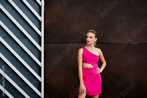 A chic girl with blond hair in a short sexy pink dress, beautiful makeup and a stylish hairstyle is standing on the street against the background of a textured wall of a modern building.